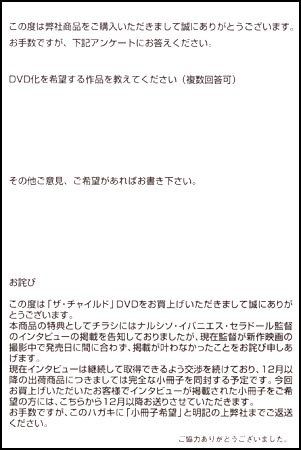 「allcinema ONLINE」のDVDレーベル「allcinema SELECTION」では、次回発売作品「ザ・チャイルド」収録のために、TV放映用吹替音源を探しております。すでに1時間半枠映画劇場のものは発見しておりますが、70年代後半から80年代半ばにTBS「月曜ロードショー」やTX「木曜洋画劇場」でオンエアされた120分版の音源がいまだ見つかっておりません。これまでは制作スタッフの知人や関係者の間で捜索しておりましたが、なかなか発見することができす、今回広く一般の映画ファンの方々のご協力をいただけないかと考え、こうして告知することにいたしました。