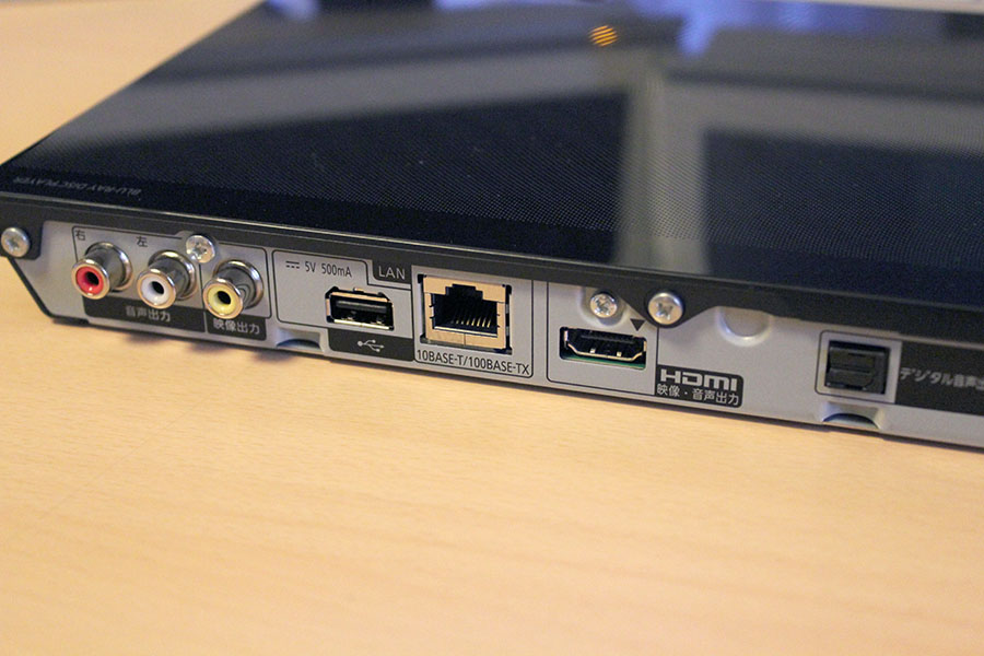 ↓各種端子。アナログ音声出力、コンポジット映像出力、USB、LAN、HDMI、光デジタル音声出力