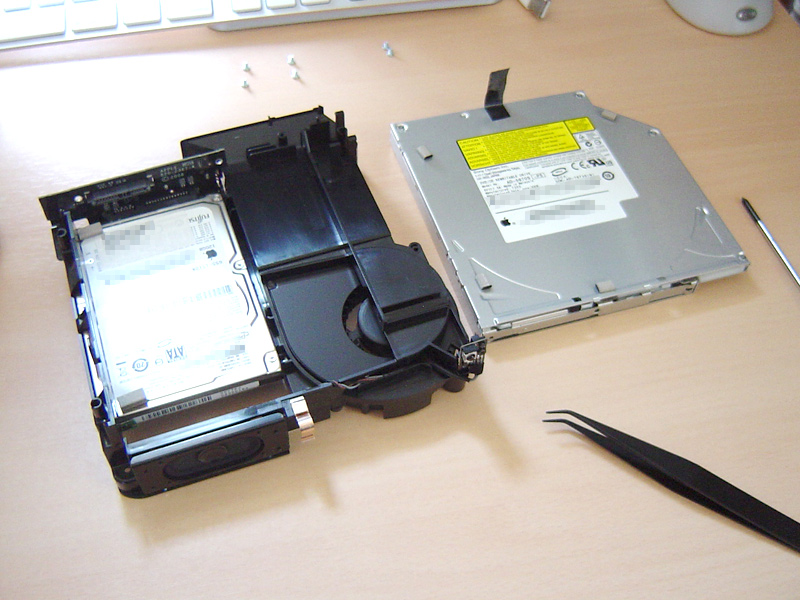 まず、ユニットからケーブルをとめているテープをはがしてから、光学ドライブを固定している6つのネジを外し、SATAコネクタのライザーカード風な基板が割れたりしないかビビりながら、光学ドライブを、、、外したー♪
