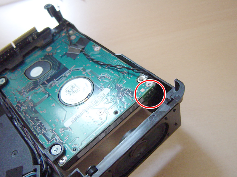 なんか温度センサみたいなのが粘着材で付いている(写真赤丸)ので、ピンセットで慎重に剥がしとり、HDDを固定している4つのネジを外す。