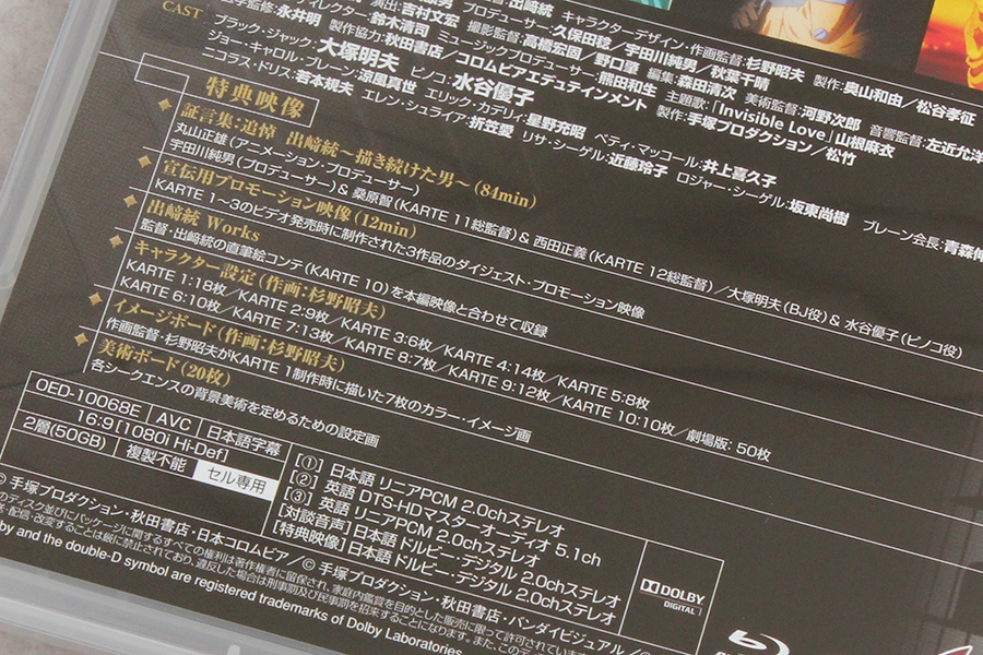 ↓BOX底 仕様。本編はすべて1080i収録で、音声は劇場版英語音声の5.1ch DTS-HDMAを除いて、すべてLPCM。コメンタリーはKARTE 1とKARTE 6、劇場版に収録。