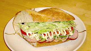 フランスパンに、レタスの千切り、タマネギ、オリーブ、ピーマン、トマト、ハムがなかったのでお歳暮でもらったパストラミポークを挟んで、パスタ用のバジルソースとマヨネーズで出来上がり。