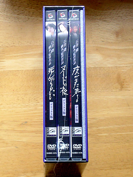 物欲記念写真 2008.03/21 11:42 投稿者:catalina 「死んでもいい」「ヌードの夜」「夜がまた来る」ニューマスター・デラックス版が届いたー(その1) 「死んでもいい」「ヌードの夜」「夜がまた来る」ニューマスター・デラックス版のamazon限定セットが朝一で届いたー。 ということで、早速記念写真。 BOXオモテ/ウラ。※すべてクリックで拡大 BOX背/口。 並べてみた。なんかしっくりこない。 やっぱこうだ。 <その2>に続く。 <追記> ・<その3>スクリーンショット編を追加。