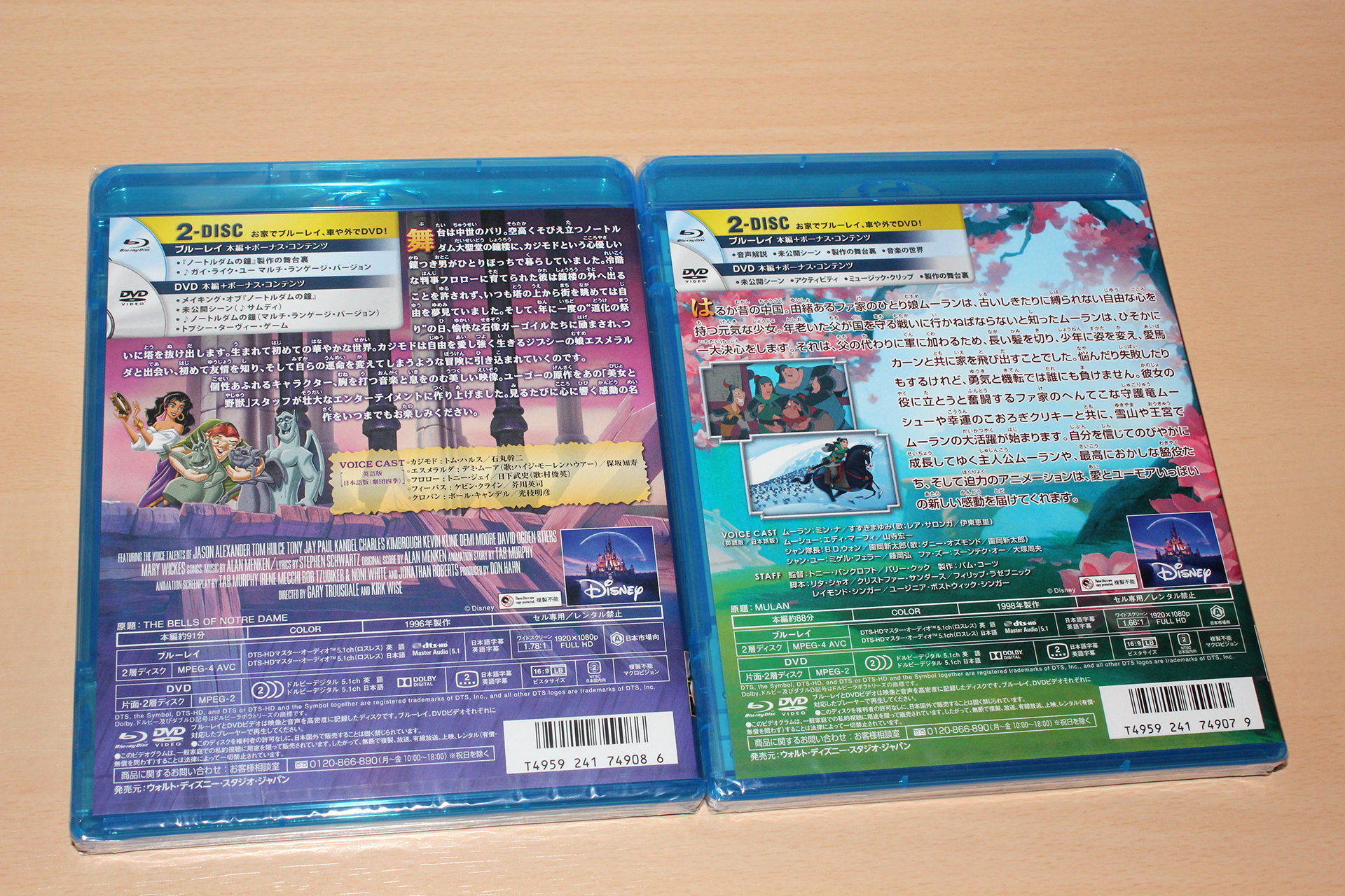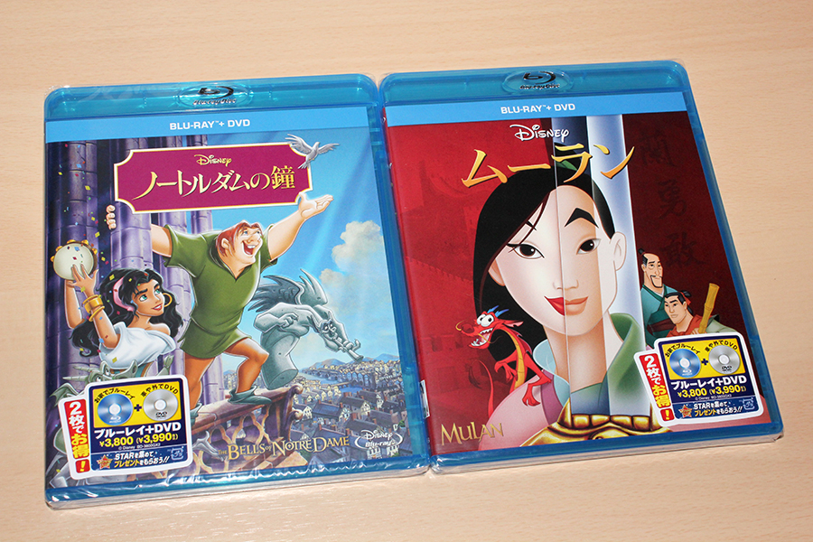 「ノートルダムの鐘 ブルーレイ+DVDセット」と「ムーラン ブルーレイ+DVDセット」が届いたー♪ので記念写真。※リンクはAmazon