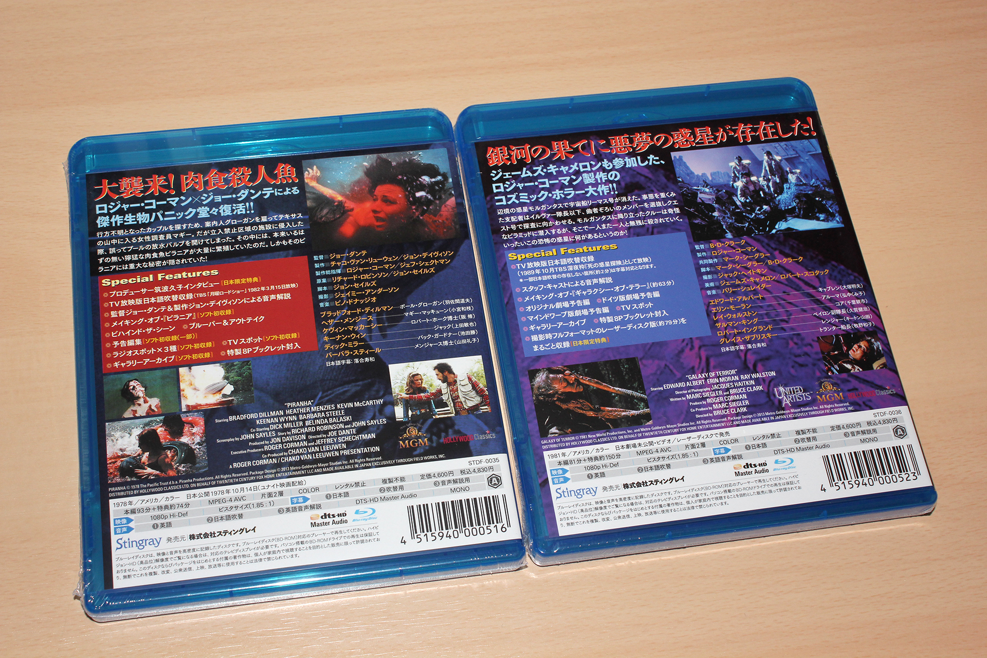 通販限定「allcinemaSELECTION」レーベルのブルーレイソフト第1弾、「ピラニア(1978)」と「ギャラクシー・オブ・テラー 恐怖の惑星」が届いたー♪ので記念写真。