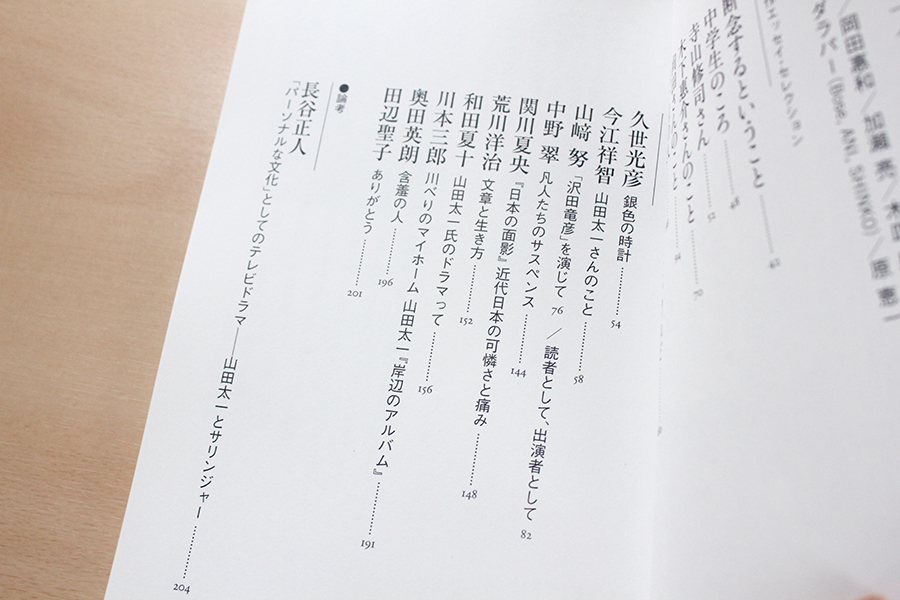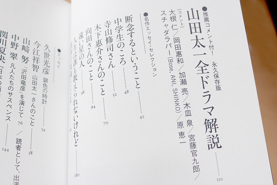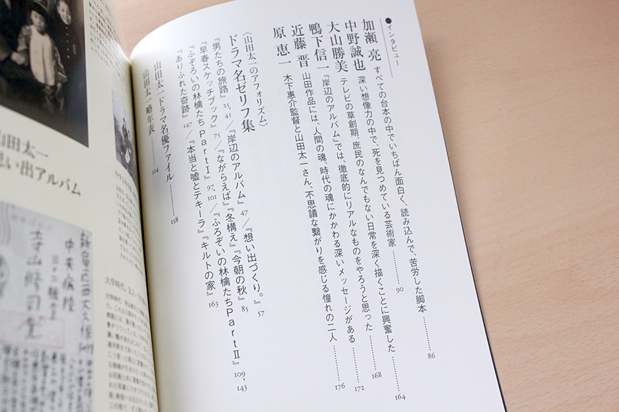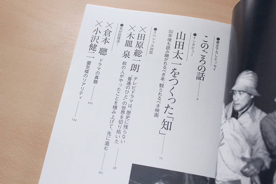新規のインタビューや、木皿泉、田原総一朗との対談などの他、過去のエッセイや作品リストなどで構成された228ページ。