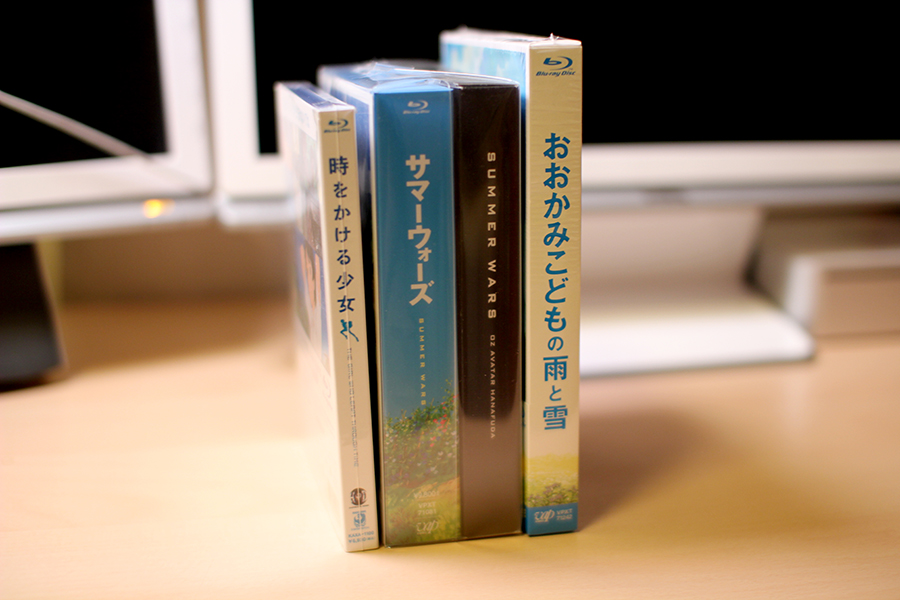 ↓細田作品BDを並べると、、、全部サイズが違う!(笑) 「時かけ」と「サマー」の違いはまぁ問題ないけど、「おおかみ」はデカいなぁコレは、、、。