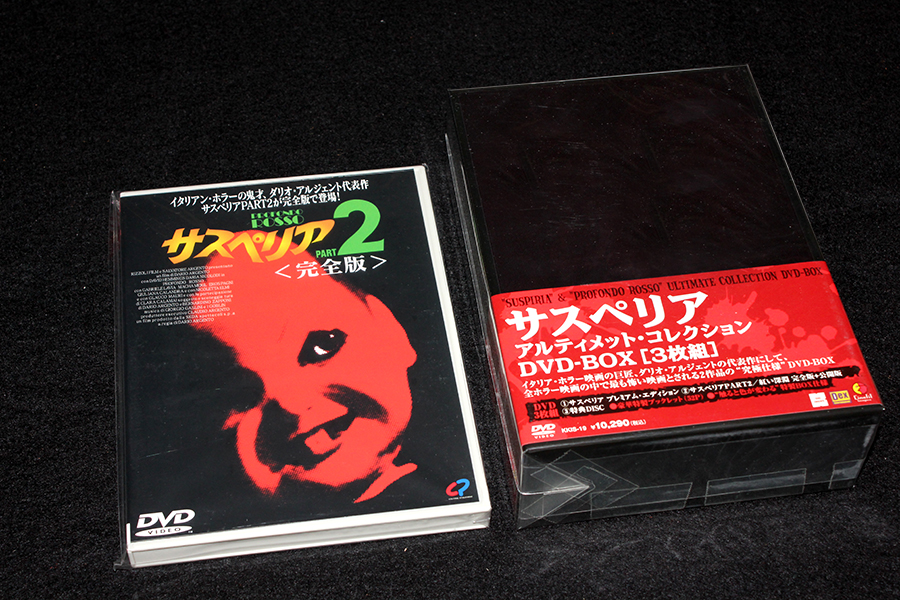 ↓左が、その「スペクトラル・コレクションLD BOX」から8ヶ月後に発売されたDVD。 右が2005年発売の「サスペリア アルティメット・コレクションBOX」。このBOX、冬は真っ黒だけど、夏になると世にも恐ろしい絵柄が浮いて出る。