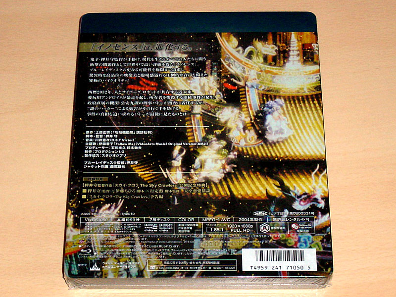 昔、アンカーベイのブリキ缶DVDを色々買ったけど、あのときはクッキー詰合せみたいな感じで、仕切りにPケースが収まってるような代物だったけど、この「イノセンス」はちゃんとケースらしいケースになってた。