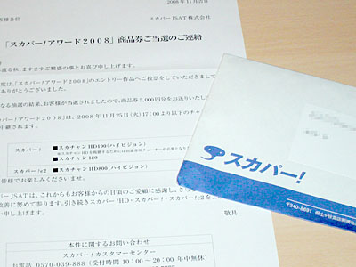 開けてみたら「スカパー!アワード2008」の商品券が当選!