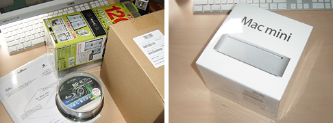 昨日の昼前、Mac miniと、ついでにオーダーしてたMac miniの保護シート、TDKのBD-R 20枚パック、BD-R用に使ってるCD/DVDファイルが到着♪