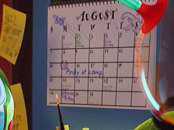 ↓冒頭のゲーム明けのカット(デジカメ撮り画面を切り抜き)。DVDでは後ろのカレンダーに書かれている日付の文字は潰れてしまっていたけども、BDでは苦もなくアンディのキャンプが8月15日の月曜日って事がわかりますな。