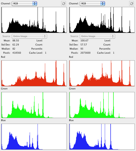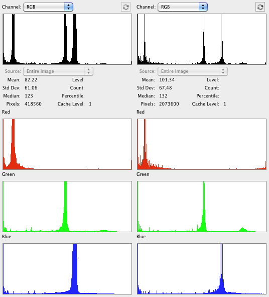 ↓ヒストグラム。(左:DVD/右:地デジ) 地デジはチャンネルロゴがあるので多少影響が出そうだけど、一応参考まで。