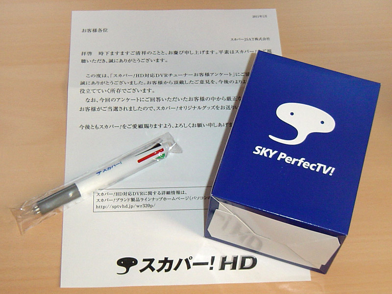 「スカパー!HD対応DVRチューナお客様アンケート」のスカパー!オリジナルグッズが当選。とのこと。