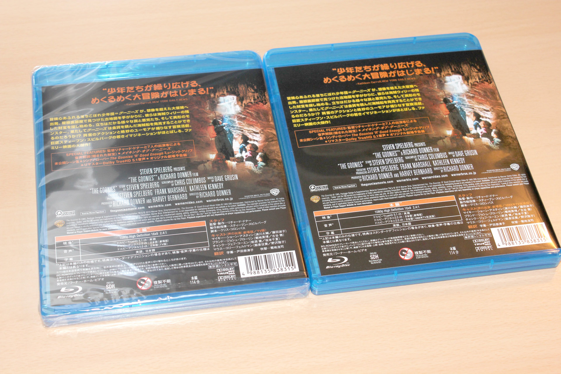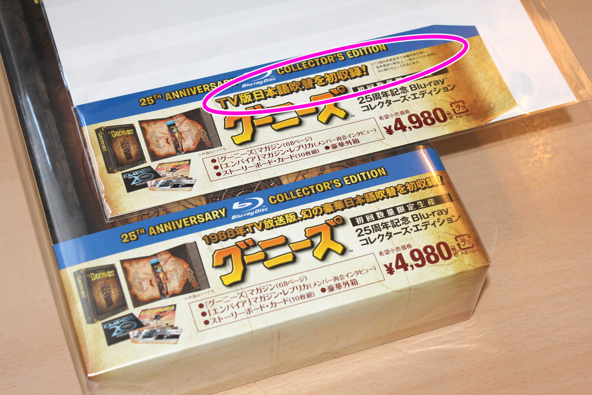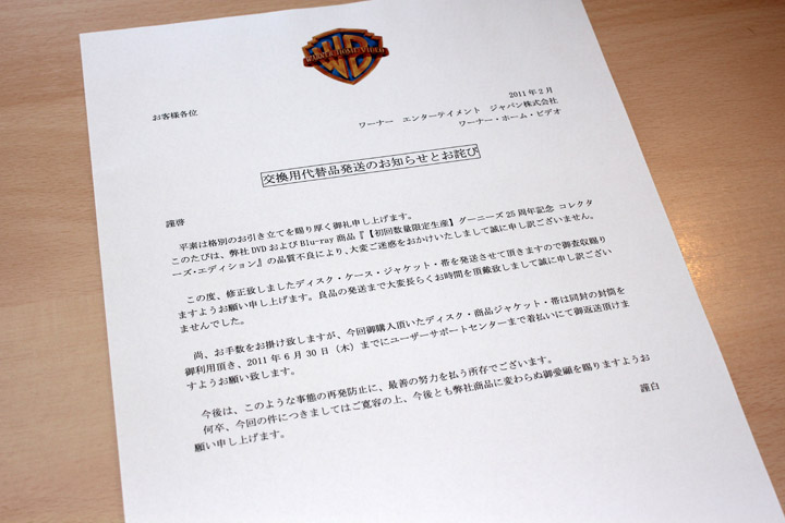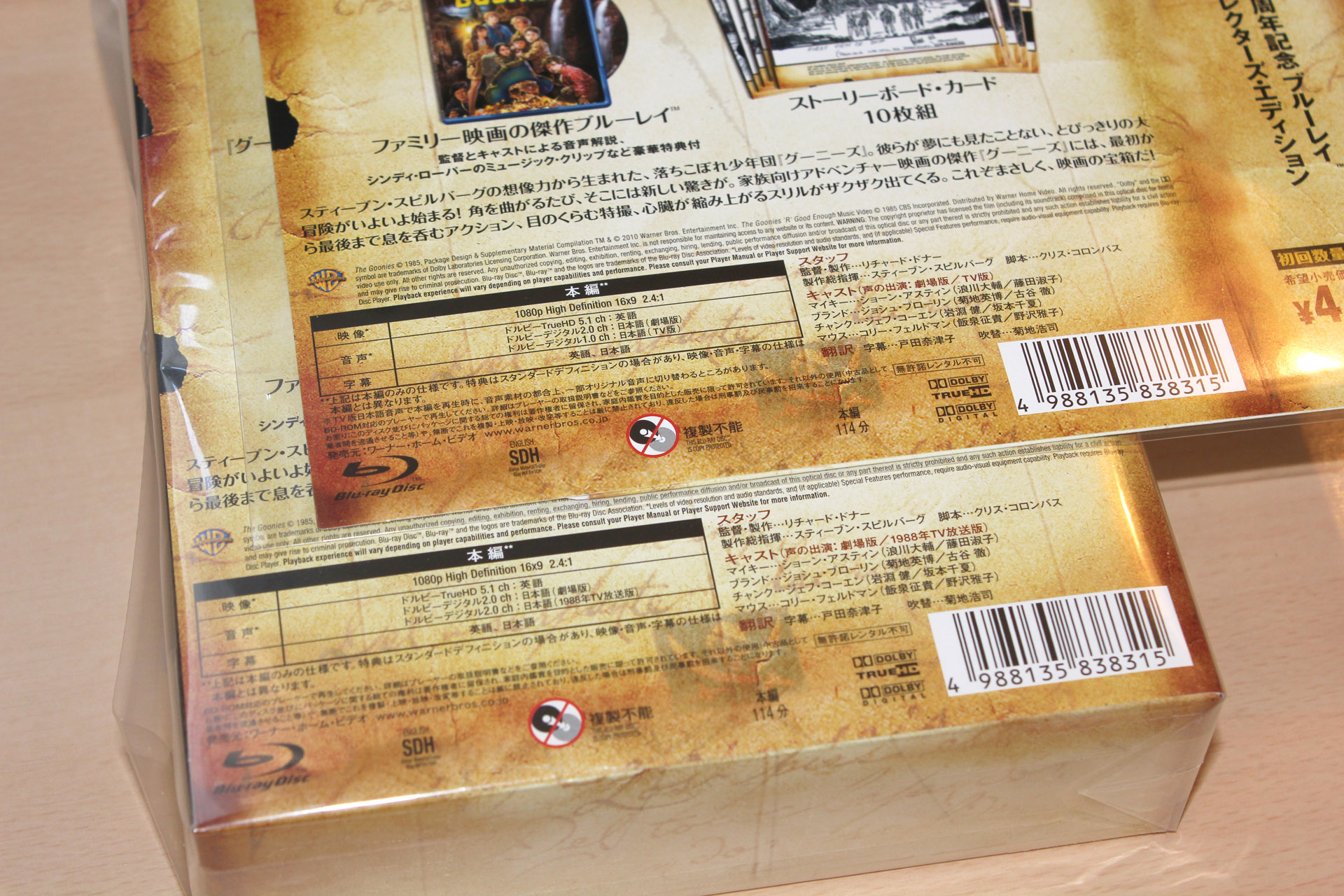 商品の目玉となっていたTV放送版吹替音声に不具合があった件で交換対応待ちとなっていた、ブルーレイ「グーニーズ 25周年記念 コレクターズ・エディション」の修正盤が届いたーので記念写真。