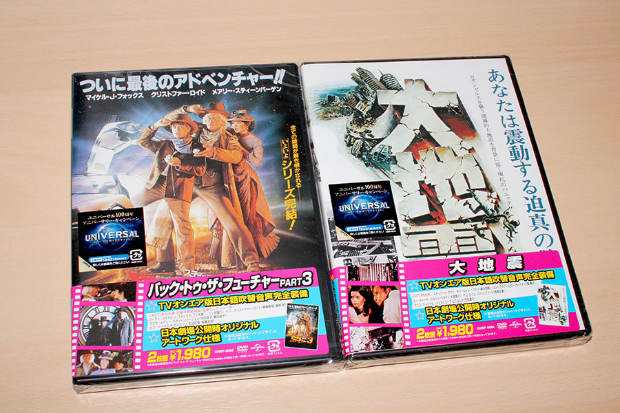 廉価再発された「ユニバーサル思い出の復刻版DVD」シリーズの「大地震」「ストリート・オブ・ファイヤー」「フィールド・オブ・ドリームス」「バック・トゥ・ザ・フューチャーPART3」が届いたー♪ので記念写真。※リンクはAmazon