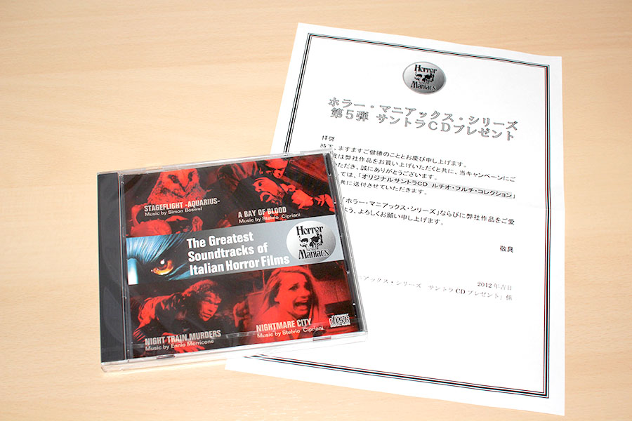 「ホラー・マニアックス」シリーズ第5期の応募者全員プレゼント オリジナルサントラCDが届いたー♪ので記念写真。