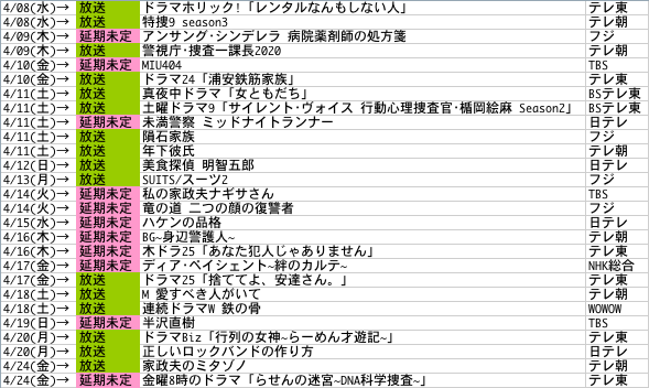 新型コロナウイルスの影響により、連続ドラマのスタート日延期が相次いでいるため、延期が決定した(「番組公式サイト」に延期が告知された)作品を一覧にしました。