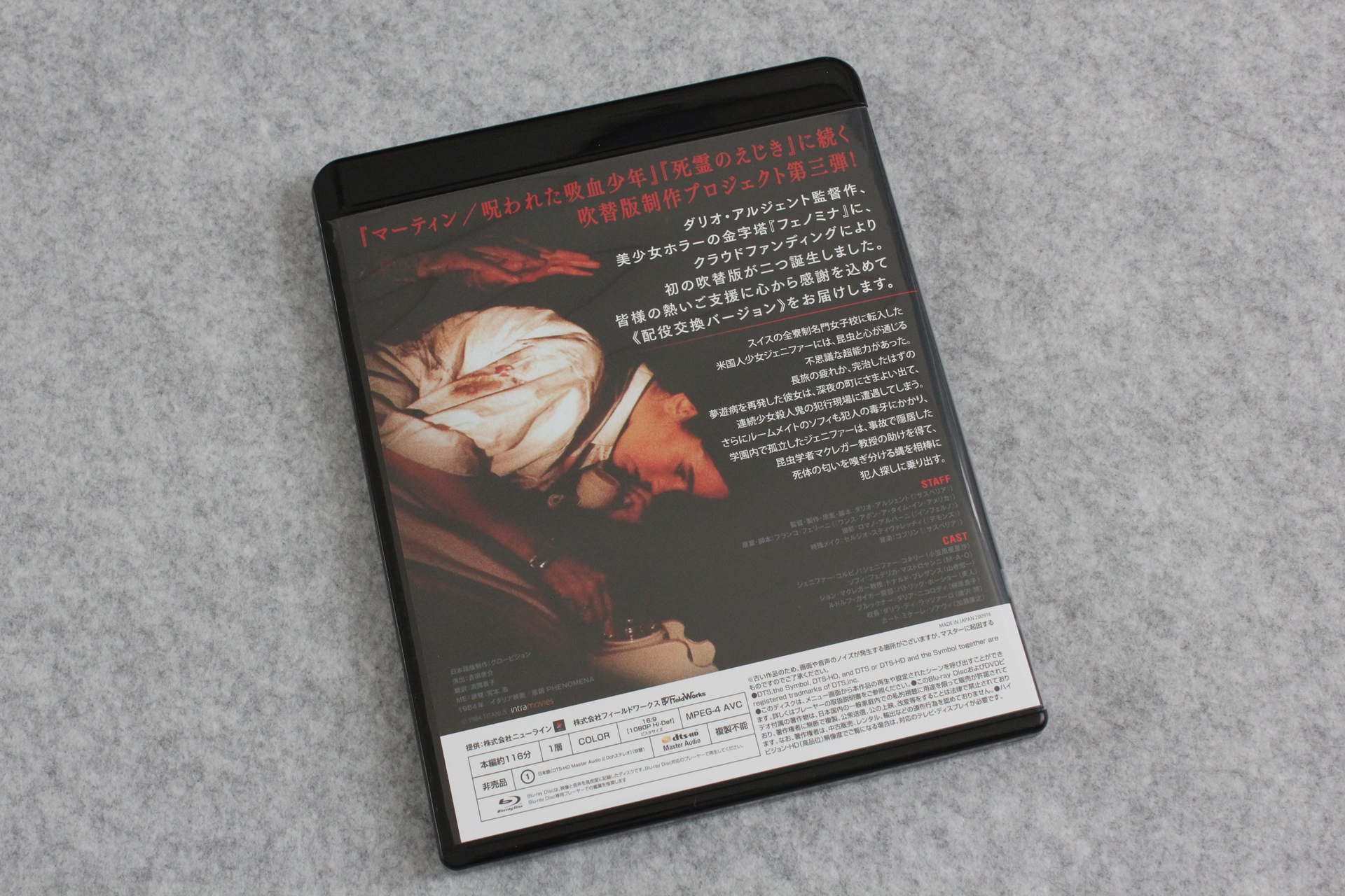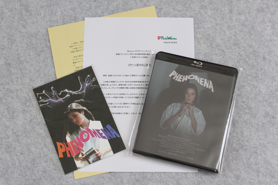 まずは、こないだツイートもしたけど、クラウドファンディング「映画『フェノミナ』 初の《日本語吹替版》制作プロジェクト!」の支援者リターン、「《配役交換バージョン吹替収録本編BD-R》&《ポストカード》も謹呈コース」(7,700円コース)のBD-R。