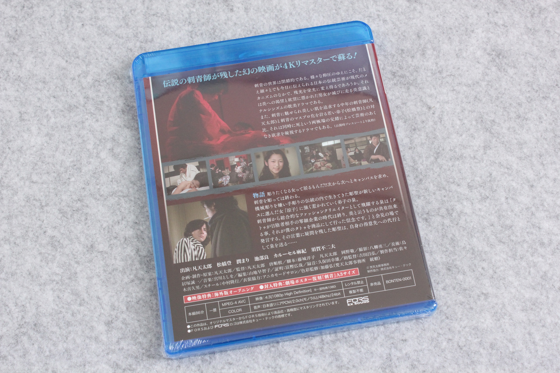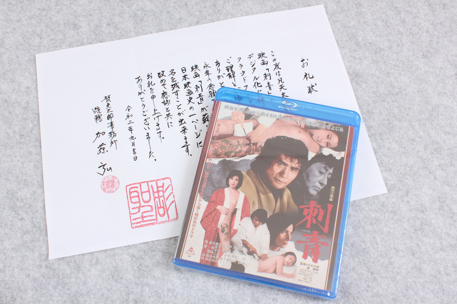 まず、クラウドファンディング「伝説の刺青師が残した幻の映画デジタル化プロジェクト 凡天太郎『刺青』ノーカット版4Kリマスター」のリターン品、「刺青」(1978年)のブルーレイ。