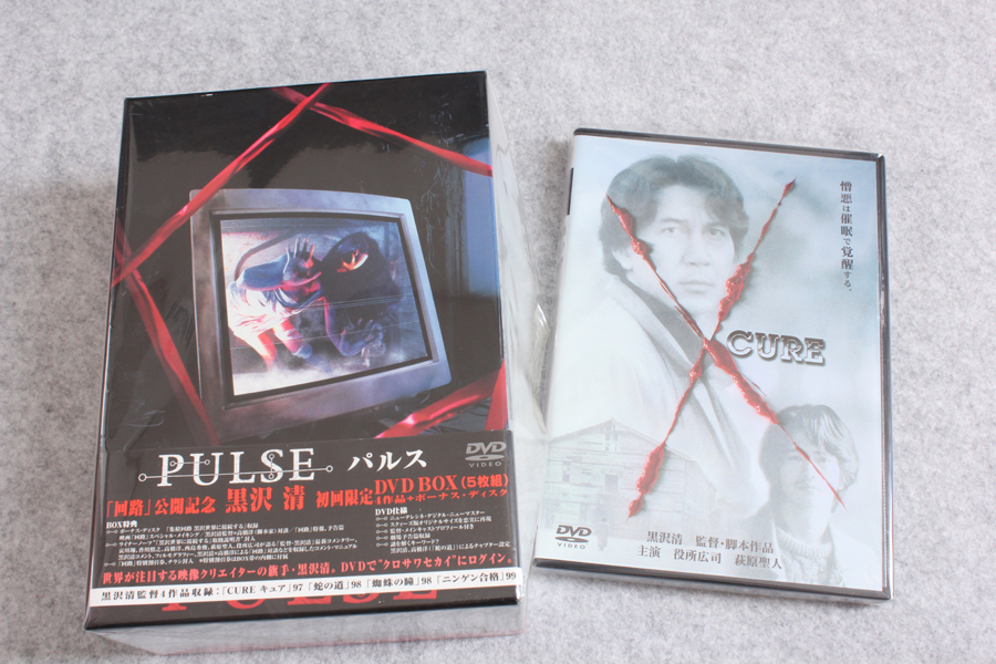 ↓「回路」公開時に発売された黒沢清監督 DVD BOX 「PULSE」(左)と、そのBOXに収録された「CURE」の国内盤DVD(右)。BOXデザインは「回路」だし、商品名は「PULSE」だしで、どこからみても「回路」の入ったBOXって雰囲気を出しまくってるけど、実際には「回路」本編は未収録でメイキングディスクのみ収録。