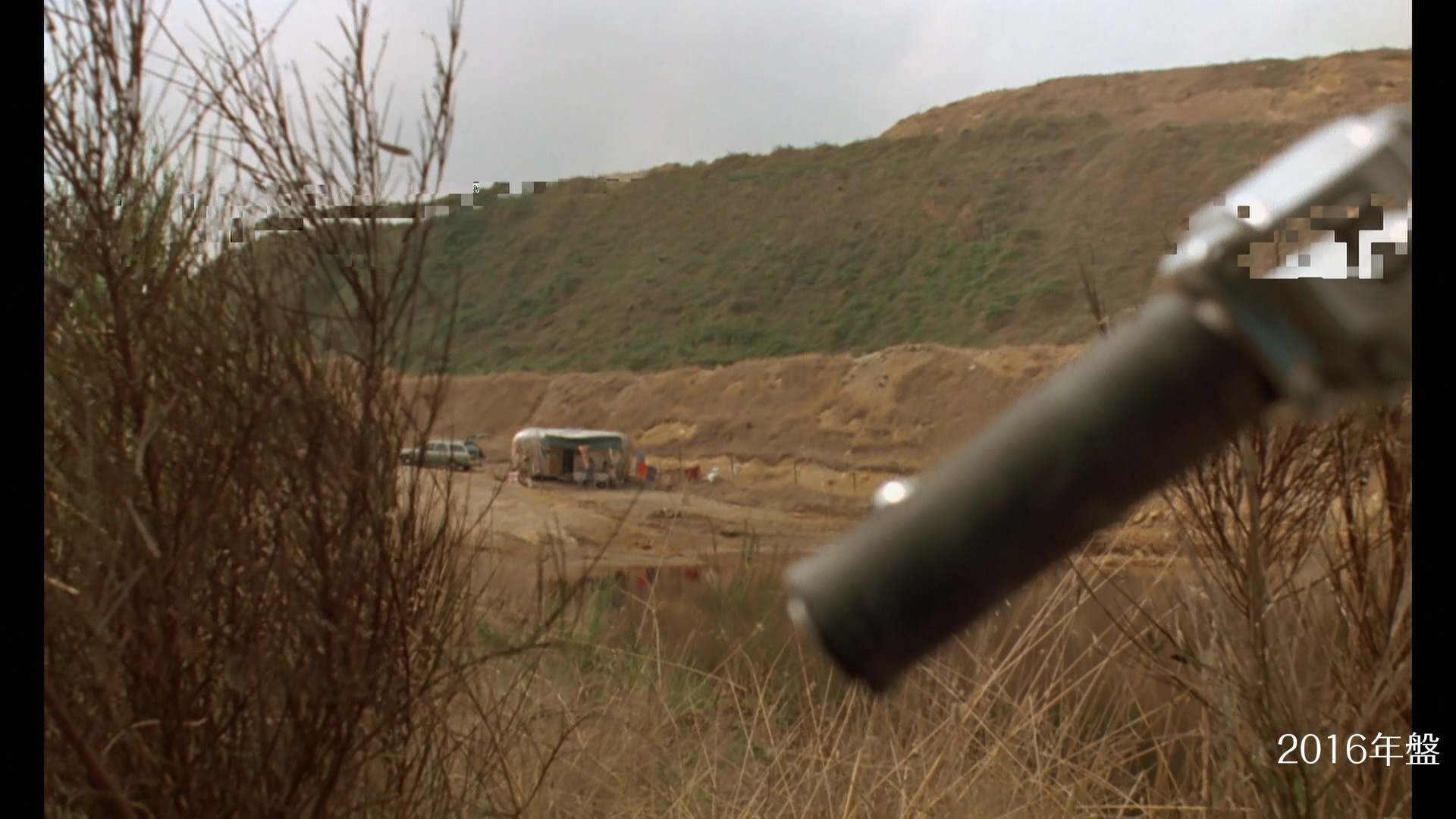 ↓まずこの2分17秒付近のカット。旧盤では、画面中央より少し上の方に10フレ前後ブロックノイズが発生していた。(画面右バイクのハンドル付近、左の枝の辺りが分かりやすい)