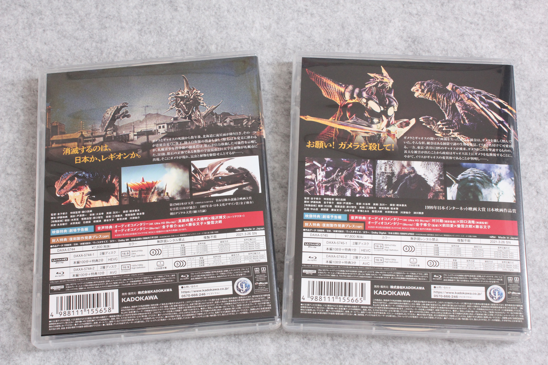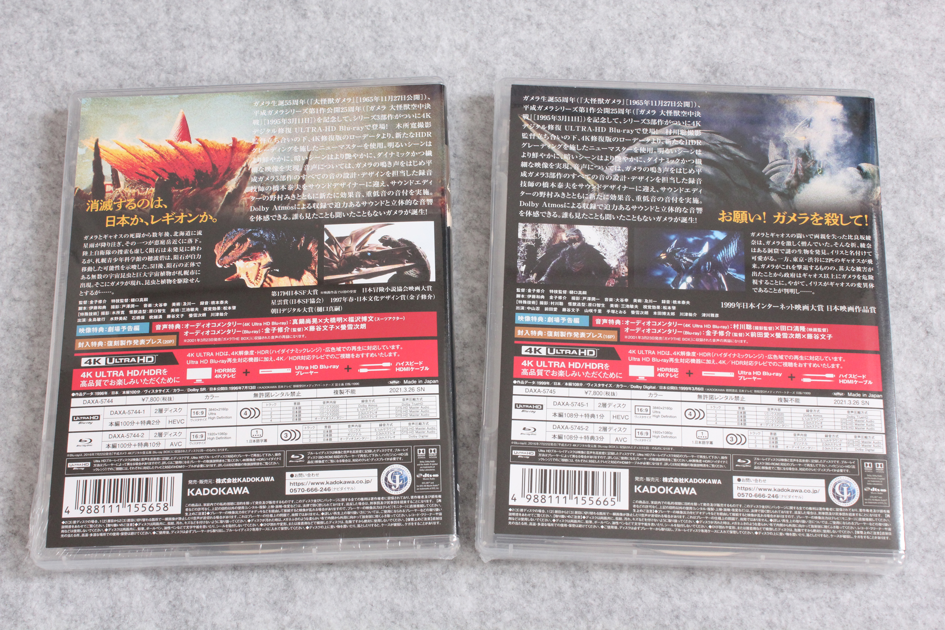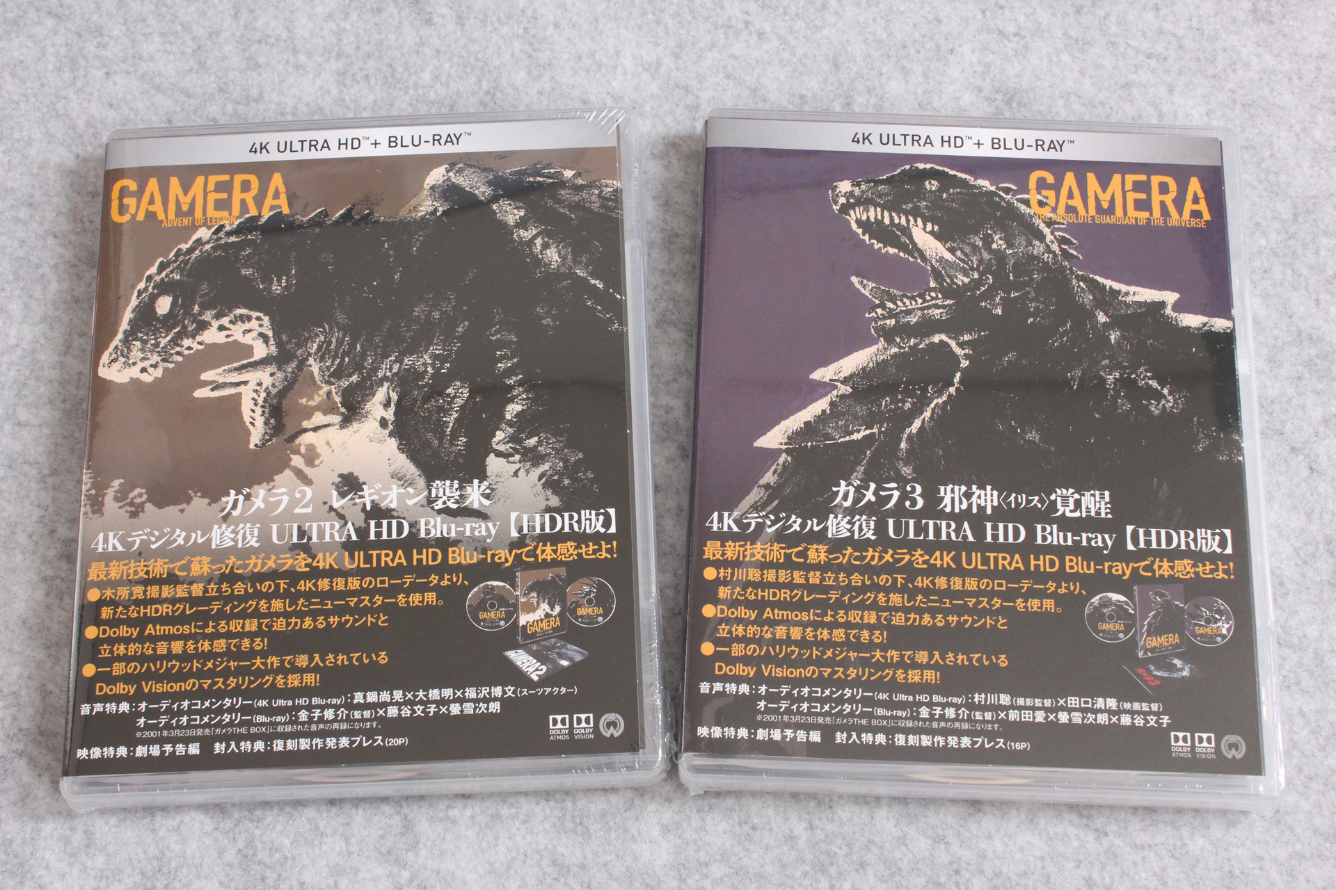 Amazonから「「ガメラ2 レギオン襲来」4Kデジタル修復 Ultra HD Blu-ray 【HDR版】(4K Ultra HD Blu-ray +Blu-ray 2枚組)」と「「ガメラ3 邪神<イリス>覚醒」4Kデジタル修復 Ultra HD Blu-ray 【HDR版】(4K Ultra HD Blu-ray +Blu-ray 2枚組)」が届いたので記念写真。※リンクはAmazon