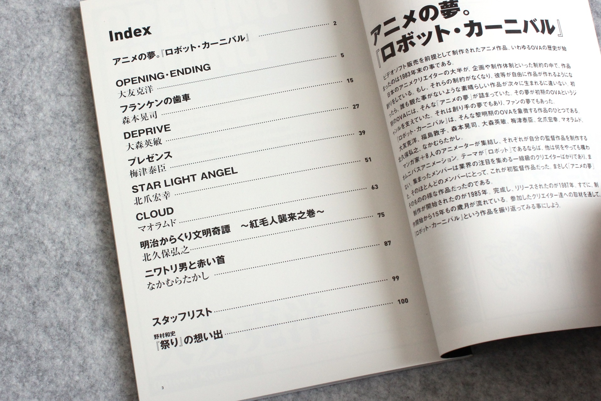 ↓解説書目次。各監督のインタビューとキャラ設定画などで構成。読み応えありまくりの104p.。