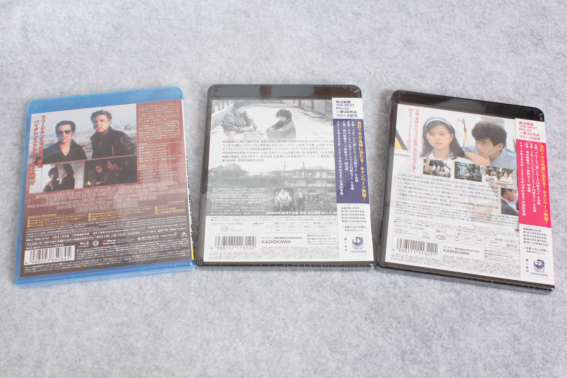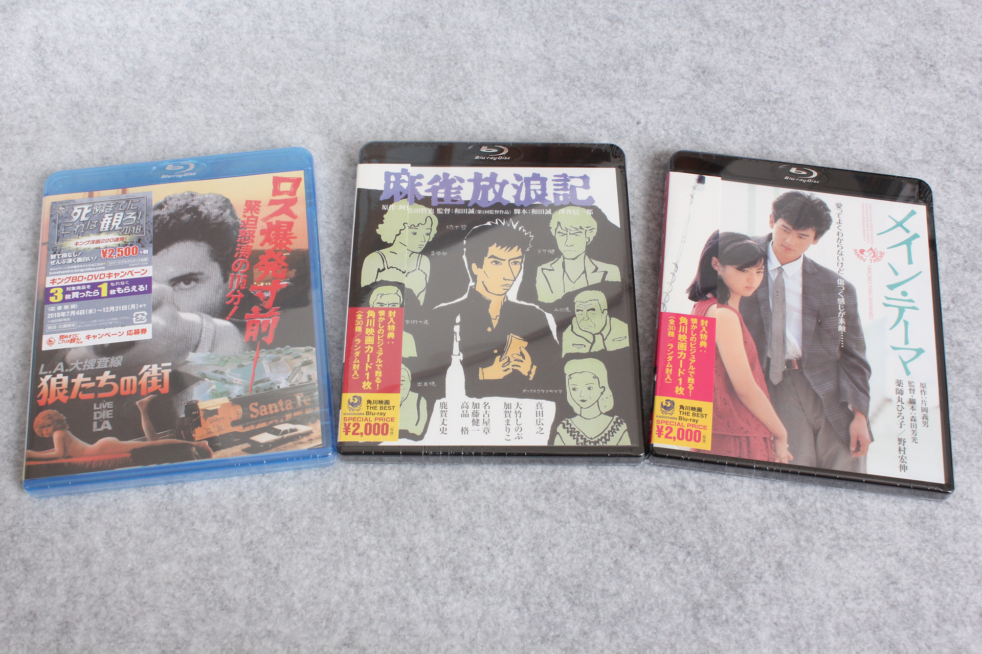 「角川映画 THE BEST」Blu-rayの「麻雀放浪記」「メイン・テーマ」と、死ぬまでにこれは観ろ!2018の「L.A.大捜査線/狼たちの街」が届いたので記念写真。※リンクはAmazon