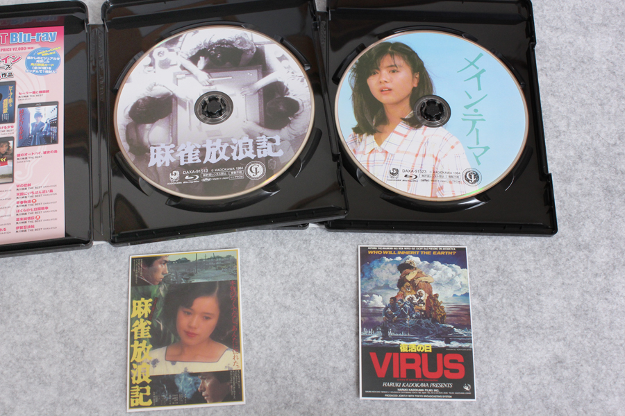 ↓角川2本のレーベル。ランダム封入のカードは、なんと「麻雀放浪記」には同じ作品のカードが入ってた!「メイン・テーマ」の方には「復活の日」のカードが。それにしても、このカード入りのシリーズ5枚買って「ヒロイン」シリーズのカードが1枚も出ないってのはどういうことだ。