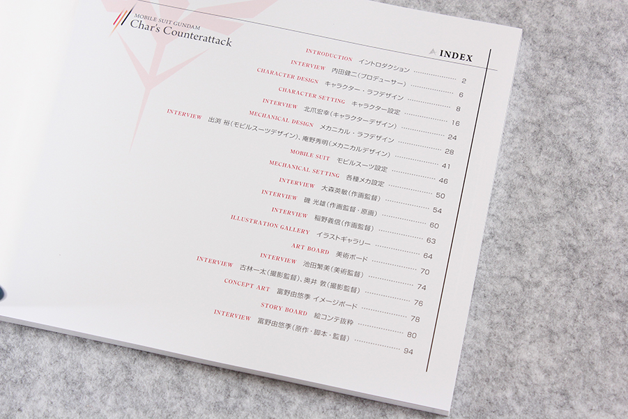 ↓「「逆襲のシャア」ドキュメントコレクション」の目次。富野や北爪宏幸のほか、庵野秀明や磯光雄、撮影監督の奥井敦らのインタビューも。