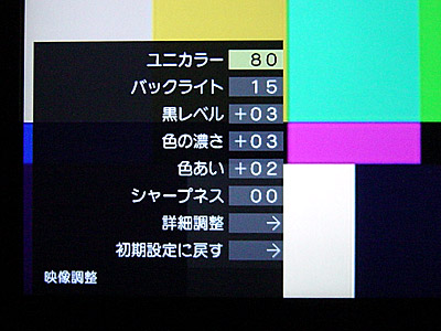 この調整値でテストチャート以外の画を見ると、パッと見、暗くて色も地味な印象を受けるけども、数分見続けると慣れてきてイイ感じになる。