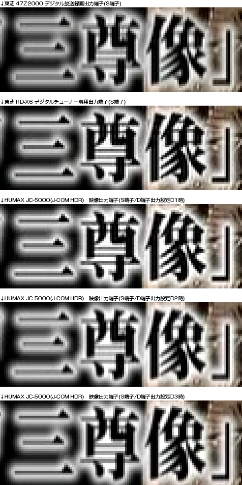 ※JC-5000は出力映像の輝度が高めになっているため、普段はRD-X6の「録画映像効果設定:録画映像モード」で適正値になる様に調整しているが、今回は同一条件での比較と言うことを重視したので、あえて他機種と同じ数値で録画。