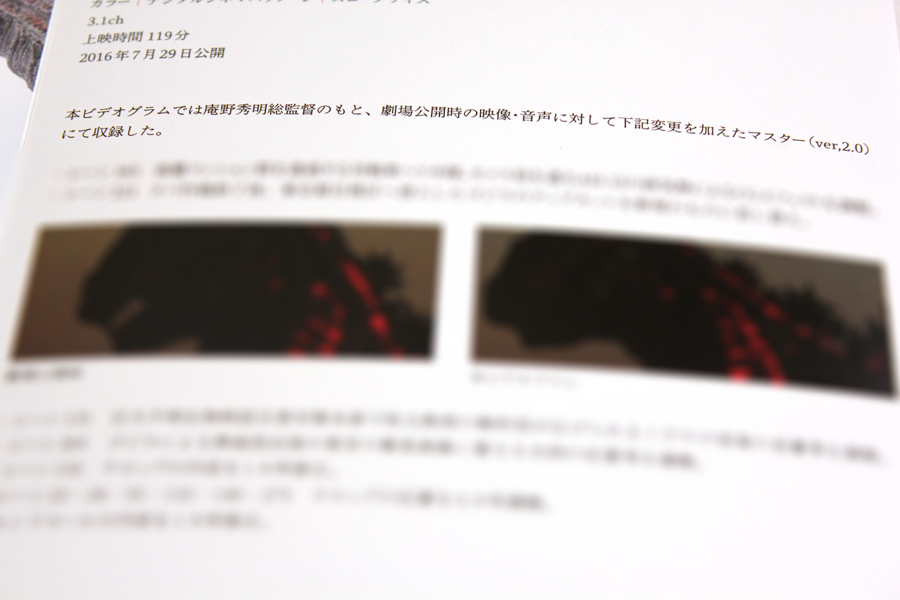 ↓ブックレット。今回収録されている本編はVer,2.0だそうで、親切にもリテイクのカットナンバーと修正箇所を明記してくれていた。洋画のDC版などで追加・削除カットが記載されているケースは結構有るけど、劇場公開→ソフト化に際して行ったリテイク箇所が記載されている事は結構少ないと思うので、こういう配慮は嬉しい。