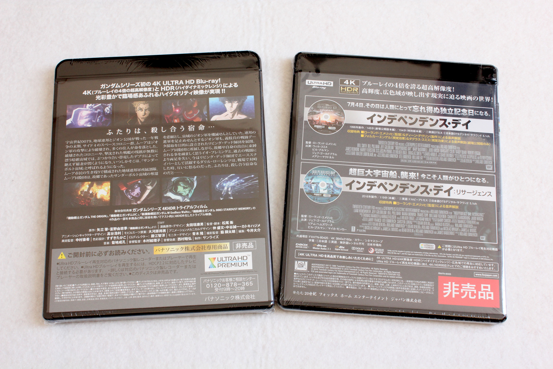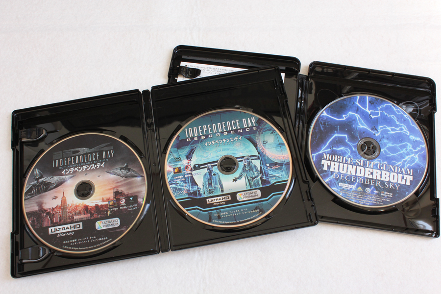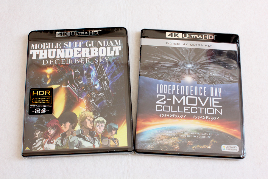 先日購入したレコーダ DMR-UBZ1020の「Panasonic Ultra HD ブルーレイ作品 プレゼントキャンペーン」で応募していた「インデペンデンス・デイ+インデペンデンス・デイ:リサージェンス」と「機動戦士ガンダム サンダーボルト DECEMBER SKY」のプレゼント品UHDBDが届いたので記念写真。