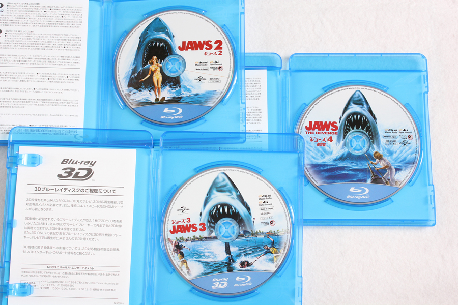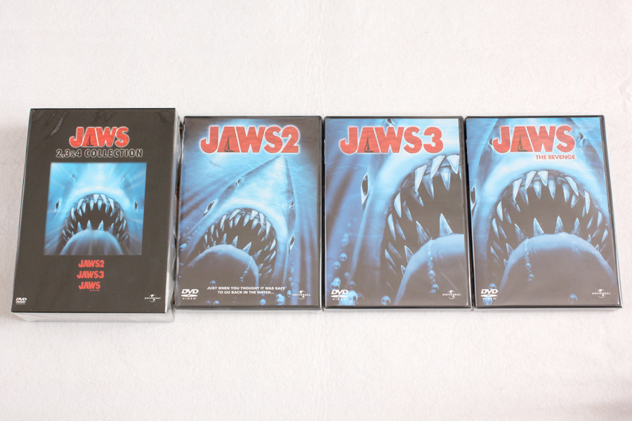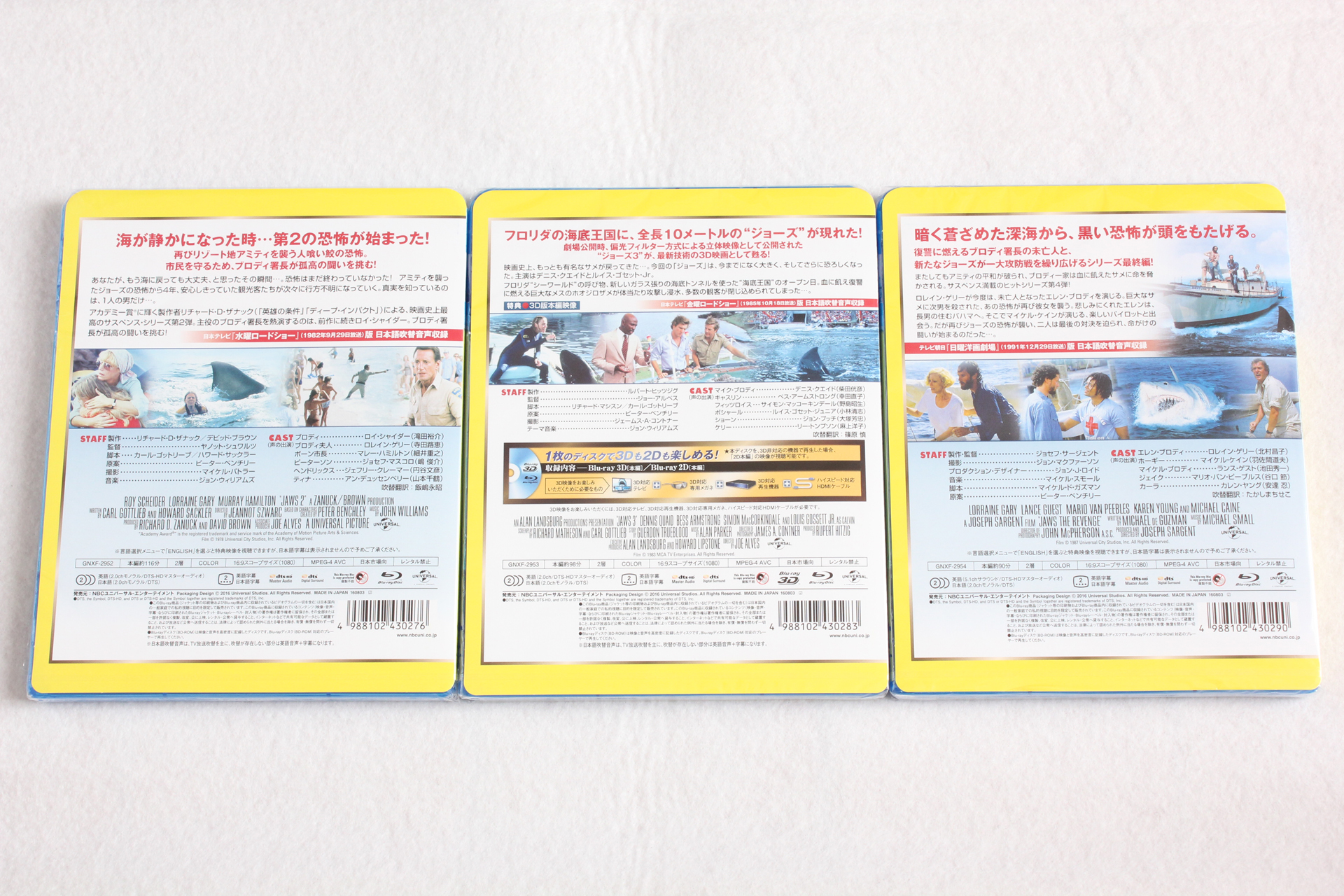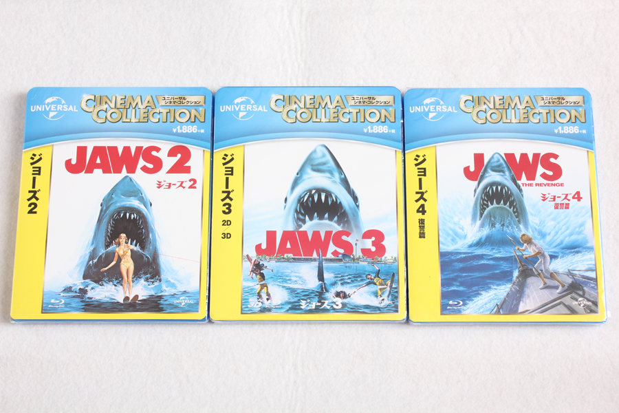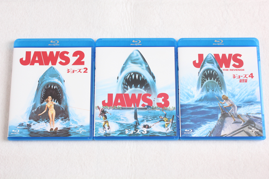 「ジョーズ2」「ジョーズ3」「ジョーズ4/復讐篇」のブルーレイが届いたので記念写真。※リンクはAmazon