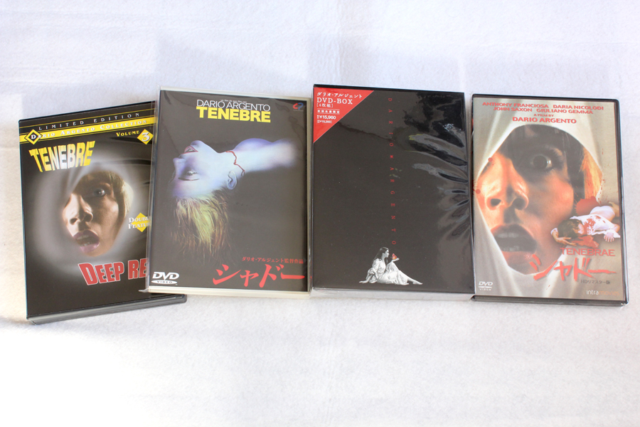 ↓過去に購入したソフトその2。左から北米アンカーベイDVD(サスペリアPART2とのカップリング盤)、最初に出た国内盤DVDのカルチュア・パブリッシャーズ盤、黒いのがフェノミナ20周年で出たイマジカ盤DVD-BOX(歓び~/~目撃者/フェノミナとのセット)、一番右のが2012年夏に出たニューラインの日本語吹替入りDVD。