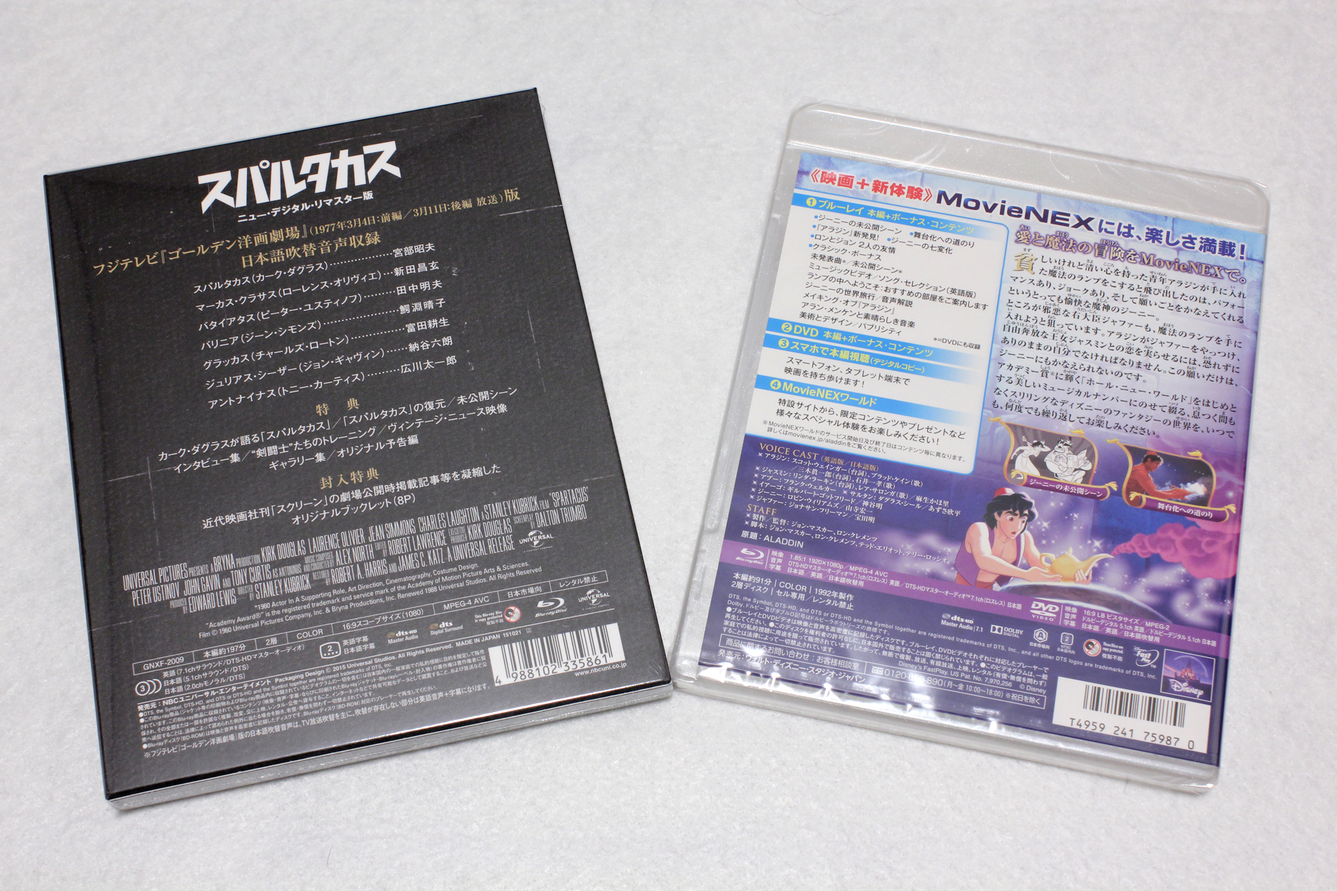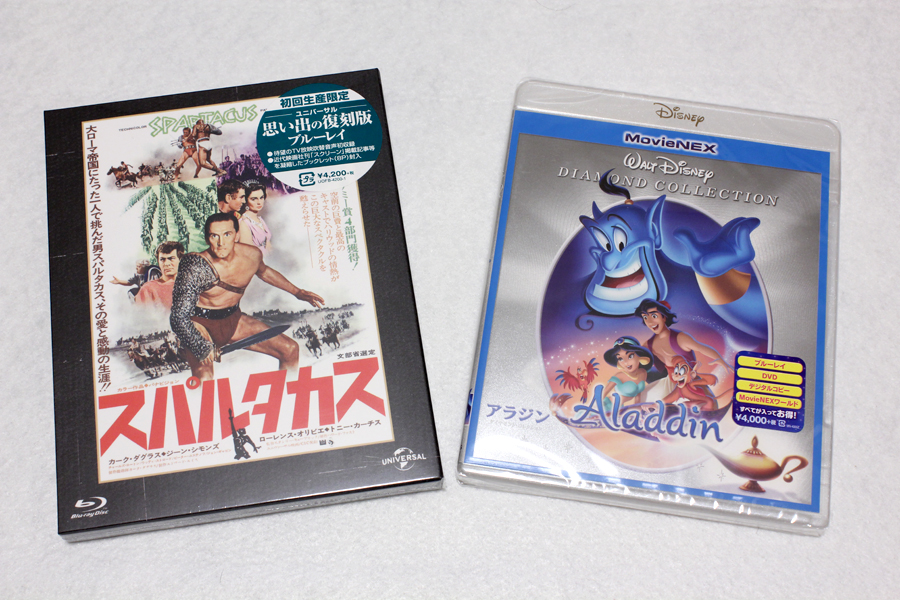 「スパルタカス ユニバーサル 思い出の復刻版 ニュー・デジタル・リマスター版 [Blu-ray]」と「アラジン ダイヤモンド・コレクション MovieNEX [ブルーレイ+DVD+デジタルコピー(クラウド対応)+MovieNEXワールド] [Blu-ray]」が届いたので記念写真。※リンクはAmazon