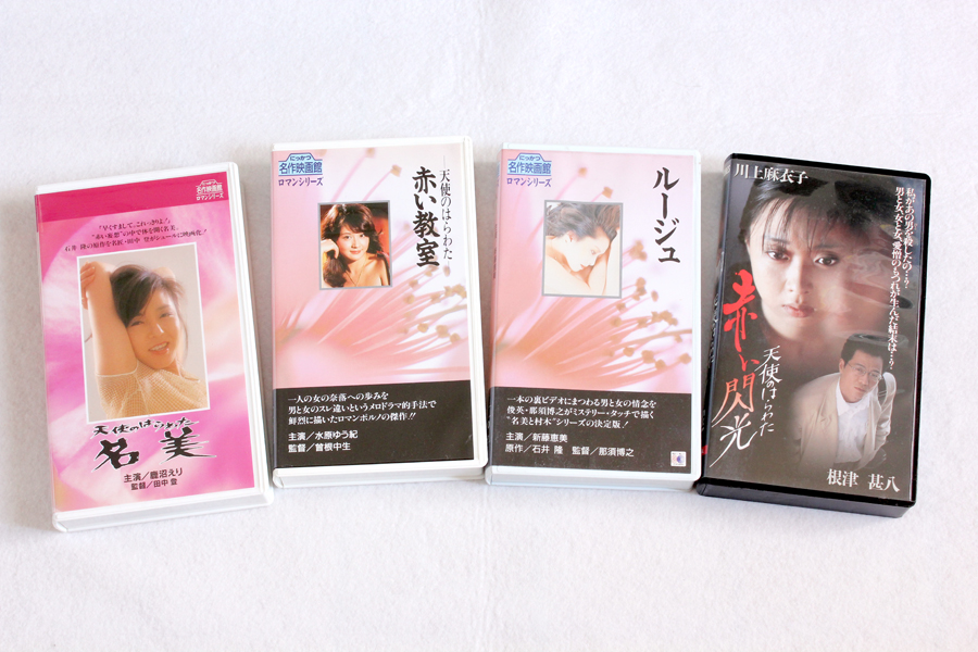↓こちらはVHS。左から、「天使のはらわた 名美」、「天使のはらわた 赤い教室」、「ルージュ」廉価版。一番右がいまだディスクソフト化が叶っていない「天使のはらわた 赤い閃光」VHS。
