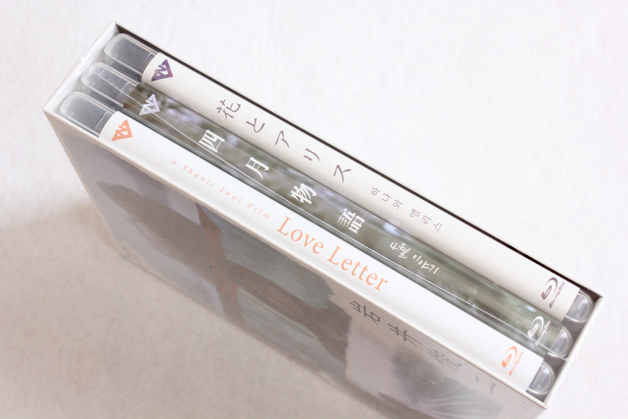 Amazonマーケットプレイスでは「「Love Letter、四月物語、花とアリス」3枚セット(ボーナス特典映像付き) – 岩井俊二監督作品集[Blu-ray][Full HD][高画質][Import]」という商品名で販売されている、岩井俊二の韓国盤BD-BOX「IWAI’S WHITE FILMS BLU-RAY BOXSET」を買ってみたので記念写真。※リンクはAmazon
