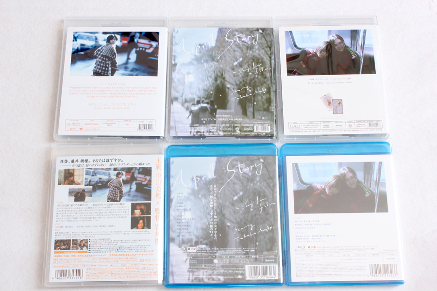 本編の画質を国内盤BDと比較してみたところ、「四月物語」と「花とアリス」に関しては、発色やサイズなどピクセルレベルでほぼ完全に一致していて、おそらく国内盤と韓国盤で同じマスターを使っていると見てよさそう。