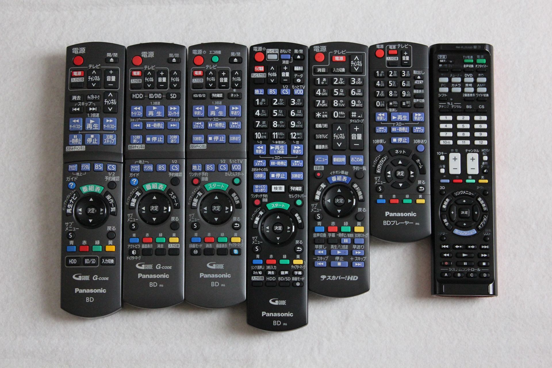 ↓リモコン箱を出してきたのでついでにリモコンの長さやボタン比較。左からBW700、BWT1000、BZT720、BRZ1000、スカパー!プレミアムサービスチューナのTZ-WR320P、BDプレーヤのDMP-BDT320、ソニーの学習リモコンRM-PLZ530D。左の3つはほぼ間違い探しのレベルですな。