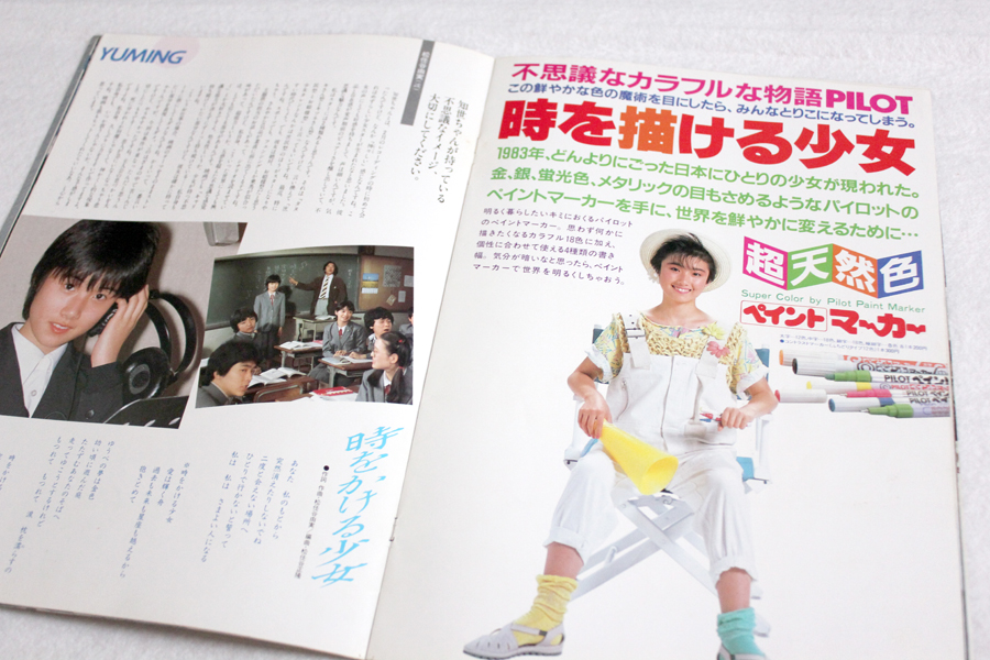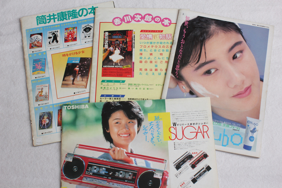 ↓パンフ裏表紙は広告。「時かけ」「愛情」は原作者の本、「早春~」は洗顔フォームの広告。表情がちょっとオトナで貴和姉さんみたい。「天国~」のは東芝のラジカセSUGARの広告。機能的にも良い製品だったということもあって、当時この赤いの買ってもらった!たしかウエストポーチみたいなのがオマケに付いてた様な気がするなぁ。